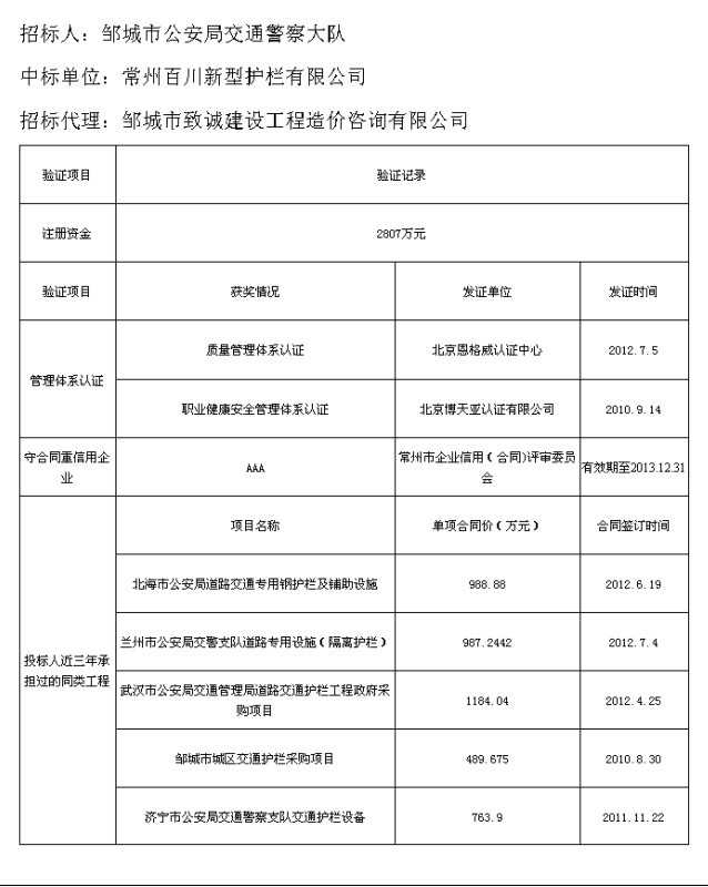 熱烈慶祝我公司在鄒城市交警大隊(duì)交通護(hù)欄采購(gòu)項(xiàng)目中中標(biāo)!